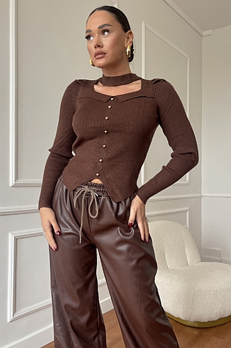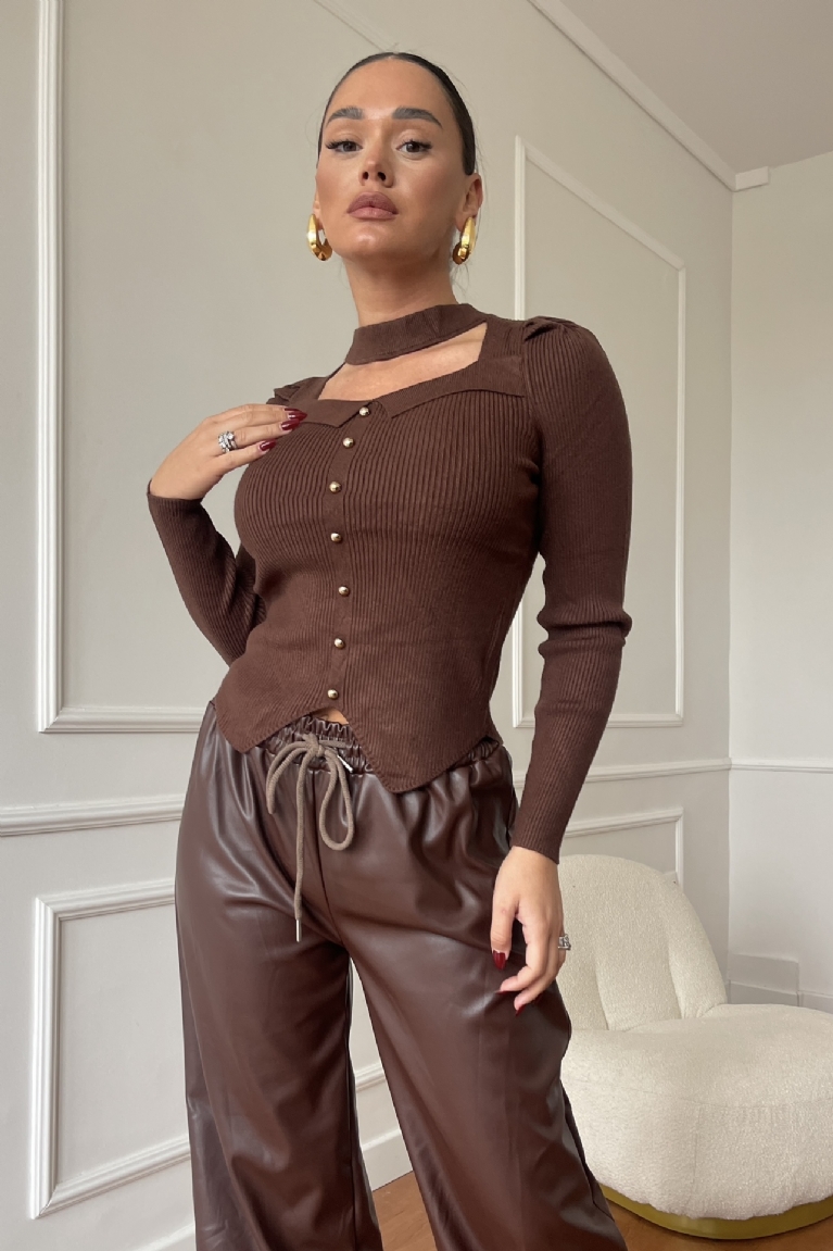Μπλούζα Πλεκτή Μακρυμάνικη Με Κουμπιά & Άνοιγμα - Καφέ