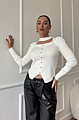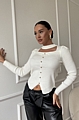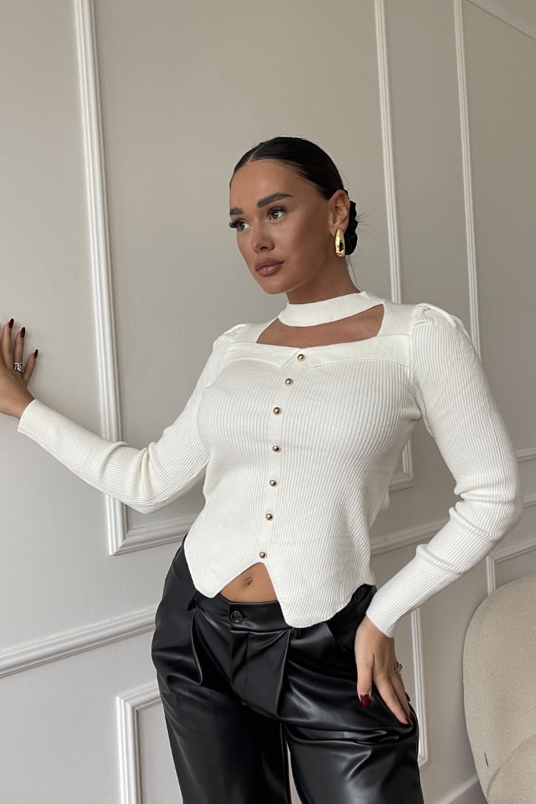 Αναδείξτε το στυλ σας με αυτή τη λευκή πλεκτή μακρυμάνικη μπλούζα με κουμπιά και εντυπωσιακό άνοιγμα στο ντεκολτέ.