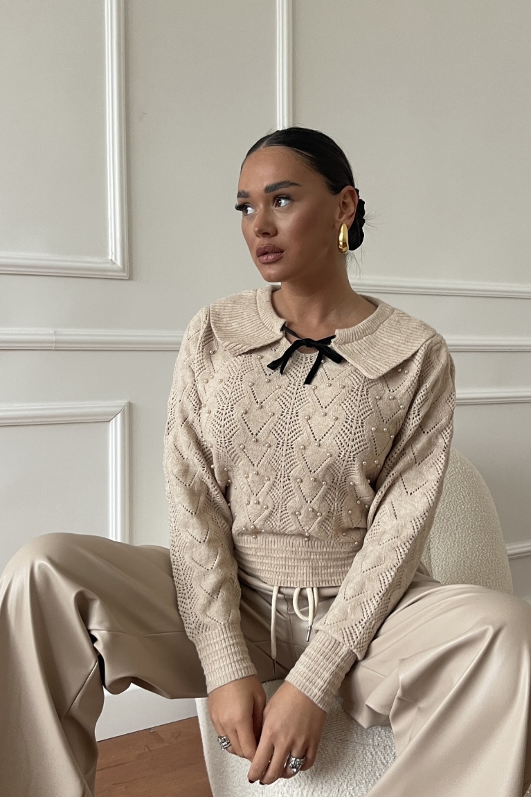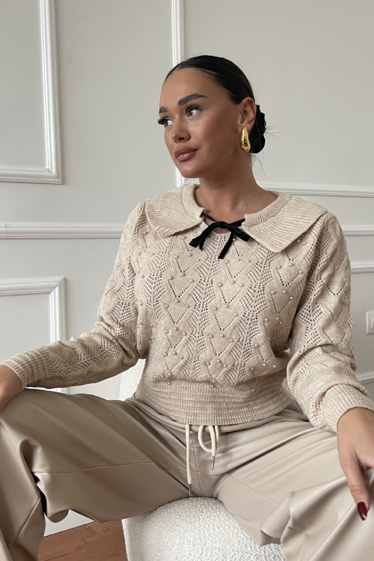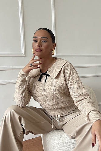 Ανανεώστε τη γκαρνταρόμπα σας με αυτή τη μοναδική πλεκτή μπλούζα σε μπεζ απόχρωση, που ξεχωρίζει με το ιδιαίτερο σχέδιο στην πλέξη και το κομψό δέσιμο στο λαιμό.