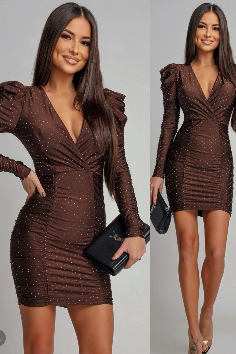Αναδείξτε τη θηλυκότητά σας με το mini φόρεμα σε καφέ απόχρωση, διακοσμημένο με εντυπωσιακά strass.