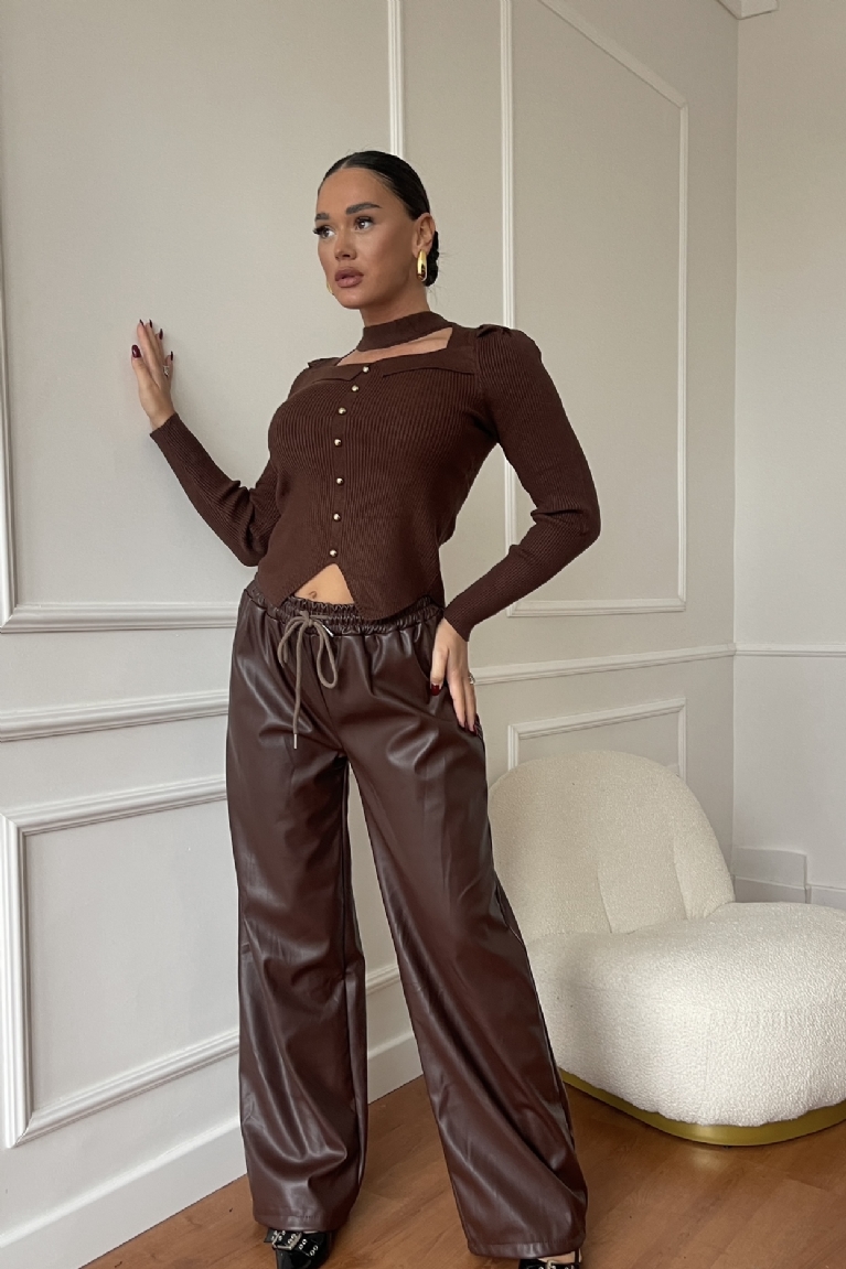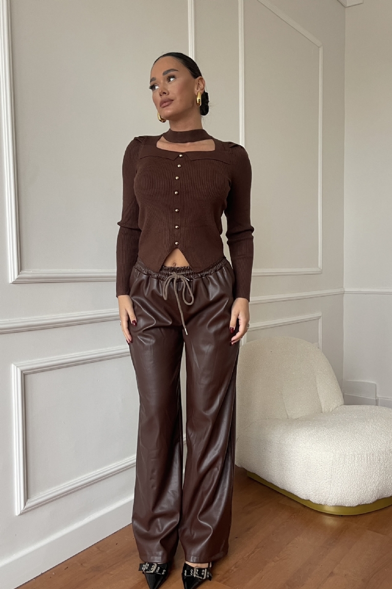 Αναβάθμισε το στυλ σου με την καφέ παντελόνα δερματίνη, ιδανική για formal εμφανίσεις.