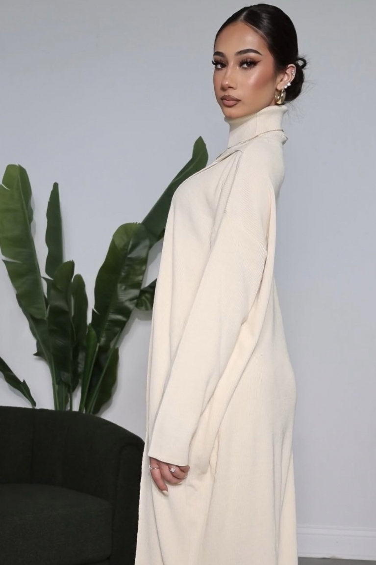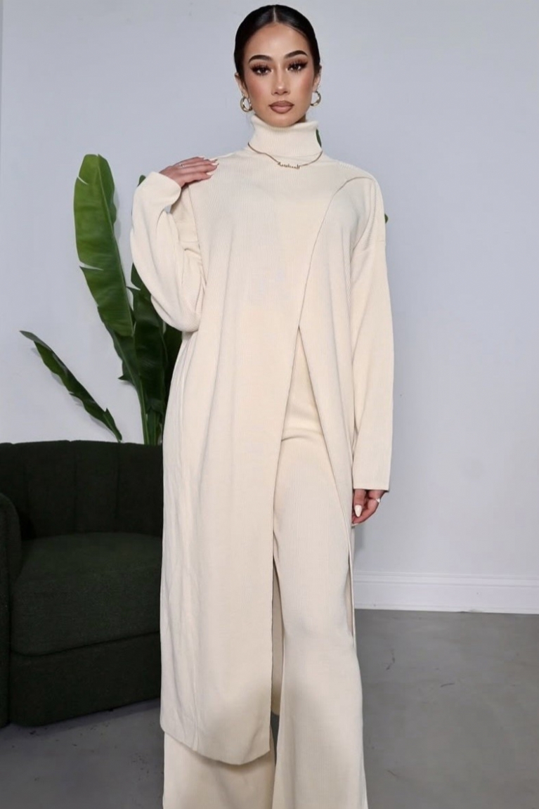 Ανανεώστε την εμφάνισή σας με το σετ πλεκτής μπλούζας ζιβάγκο ασύμμετρης γραμμής και παντελόνας σε εκρού απόχρωση.