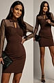 Εντυπωσιάστε σε κάθε σας εμφάνιση με το mini μακρυμάνικο φόρεμα σε καφέ χρώμα με διαφάνεια και λαμπερά strass.