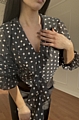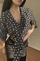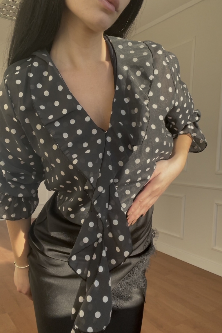 Ανανεώστε το στυλ σας με τη μαύρη πουά μπλούζα με βολάν, ιδανική για formal εμφανίσεις.