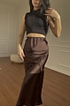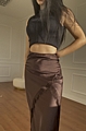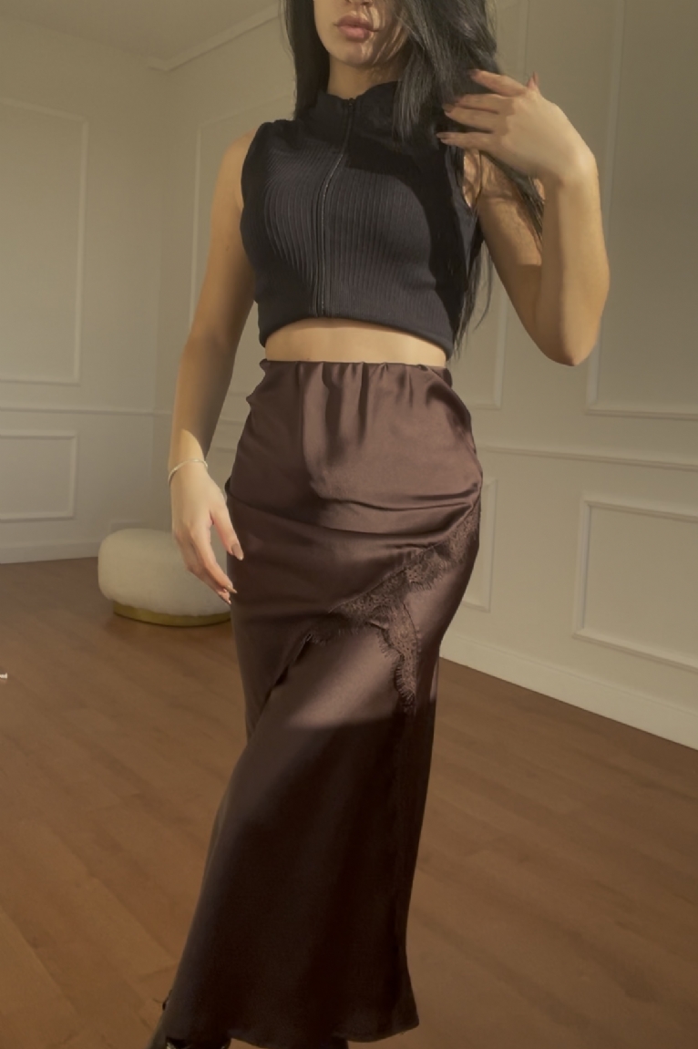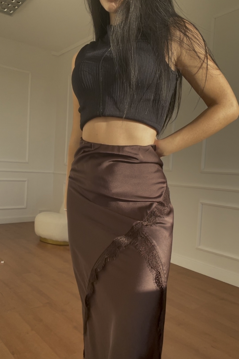 Αναδείξτε τη θηλυκότητά σας με τη φούστα σατέν σε κομψό καφέ χρώμα, διακοσμημένη με εκλεπτυσμένη δαντέλα.