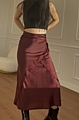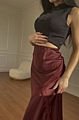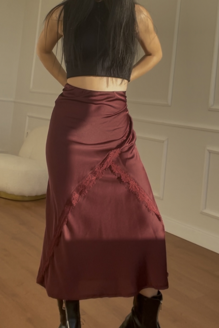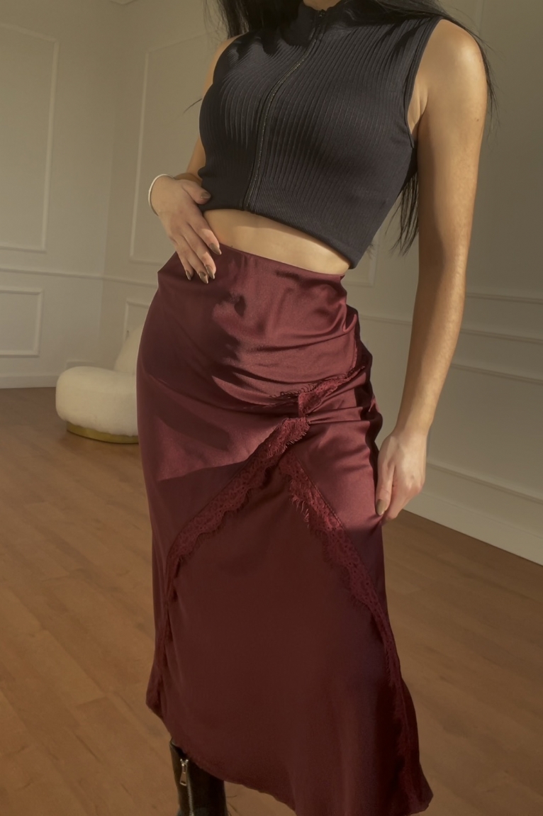 Αναδείξτε τη θηλυκότητά σας με τη φούστα σατέν σε μπορντό χρώμα, διακοσμημένη με κομψή δαντέλα.