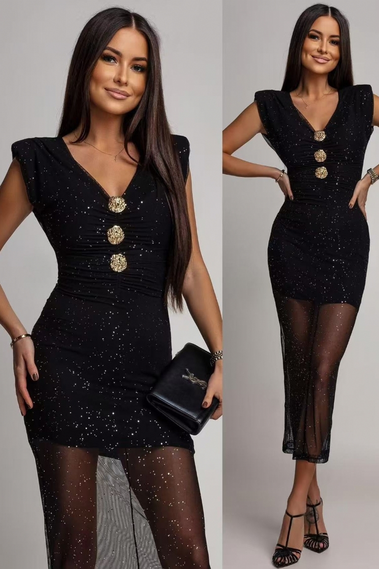 Αναδείξτε τη φινέτσα σας με το μαύρο αμάνικο φόρεμα με βάτες και εντυπωσιακή διαφάνεια στο τελείωμα.