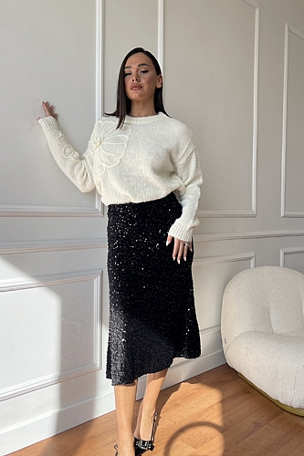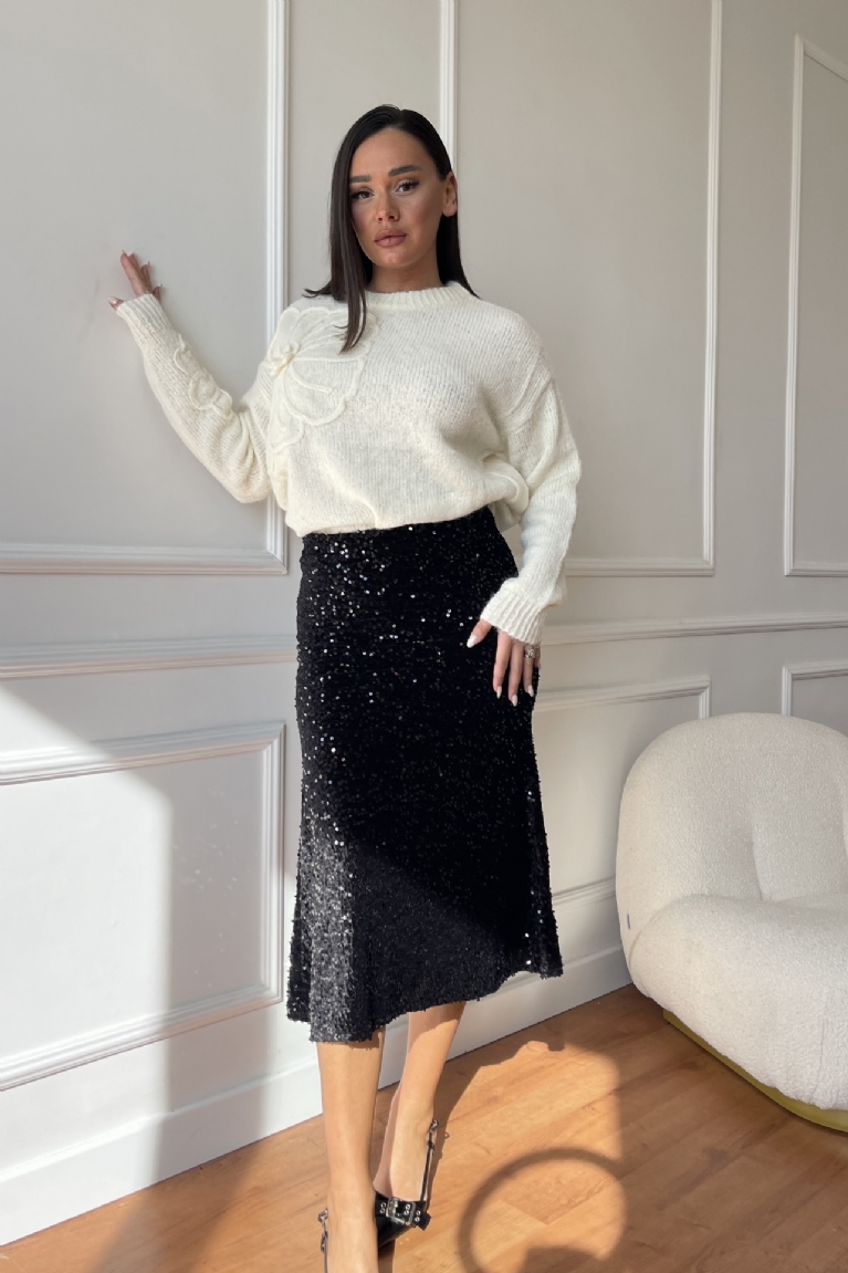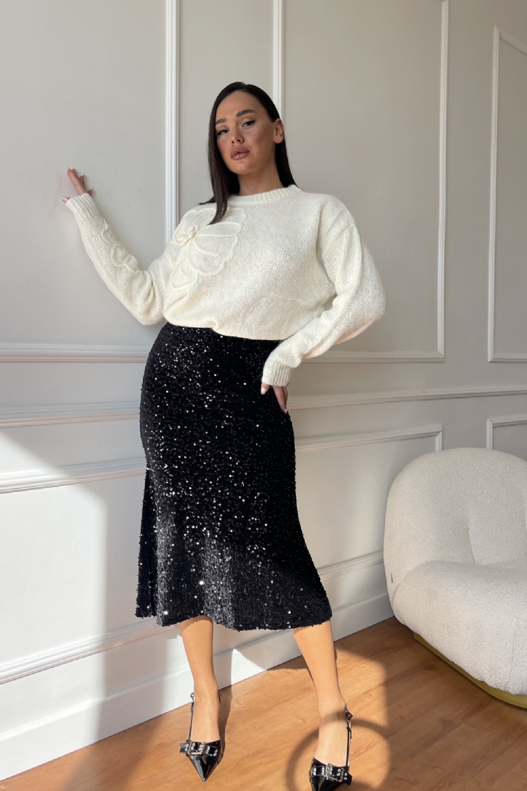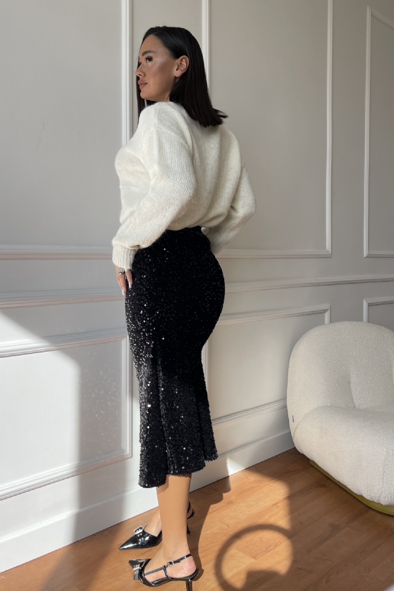 Απογείωσε το στυλ σου με τη μαύρη midi φούστα παγιέτα, ιδανική για εντυπωσιακές formal εμφανίσεις.