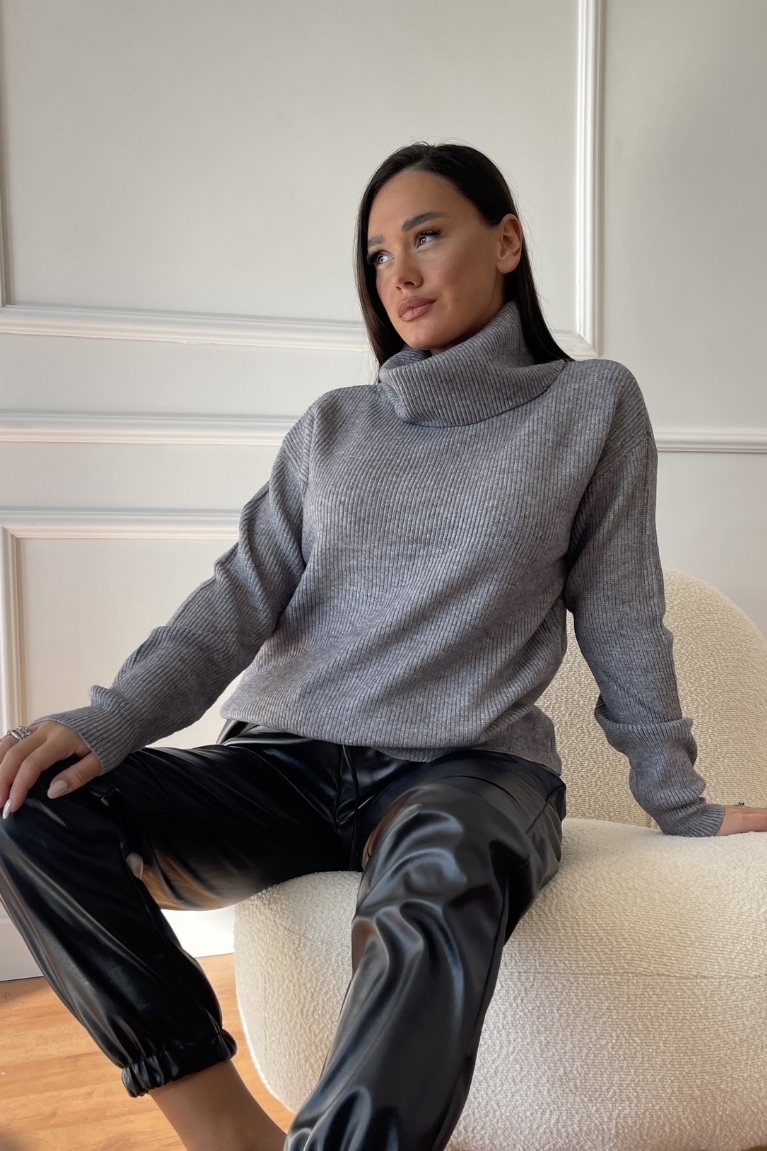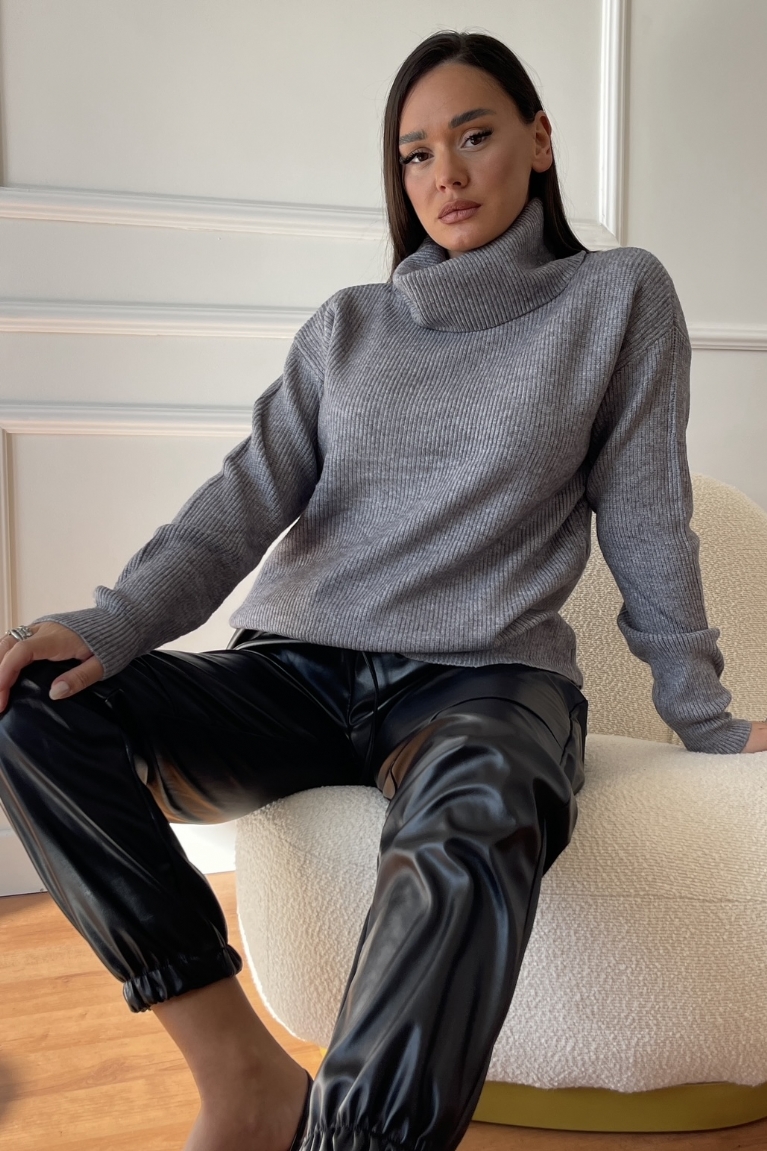 Αναδείξτε το στυλ σας με αυτή τη γκρι πλεκτή ζιβάγκο μπλούζα, ιδανική για κομψές και formal εμφανίσεις.
