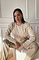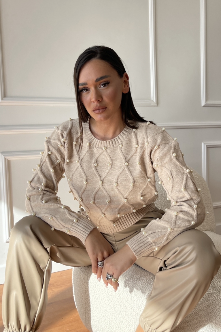 Αναδείξτε το στυλ σας με τη μοναδική πλεκτή crop μπλούζα με διακοσμητικές πέρλες σε κομψό μπεζ χρώμα.
