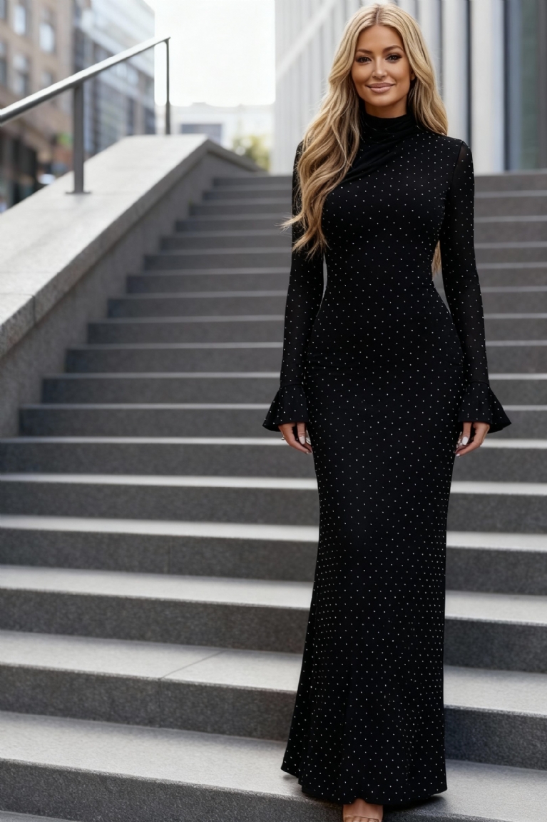 Εντυπωσιάστε σε κάθε περίσταση με το μακρύ φόρεμα με strass σε μαύρο χρώμα.