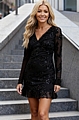 Αναδείξτε τη λάμψη σας με αυτό το μακρυμάνικο mini φόρεμα σε μαύρο χρώμα, διακοσμημένο με εντυπωσιακές παγιέτες και διαφάνειες.