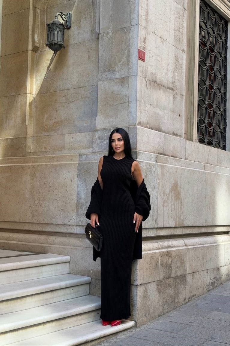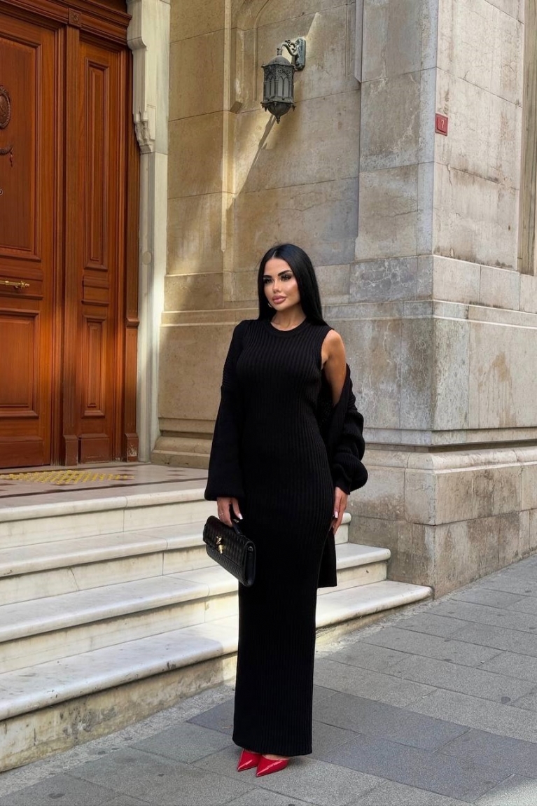 Σετ Φόρεμα Πλεκτό Ζιβάγκο & Μακρυά Ζακέτα - Μαύρο
