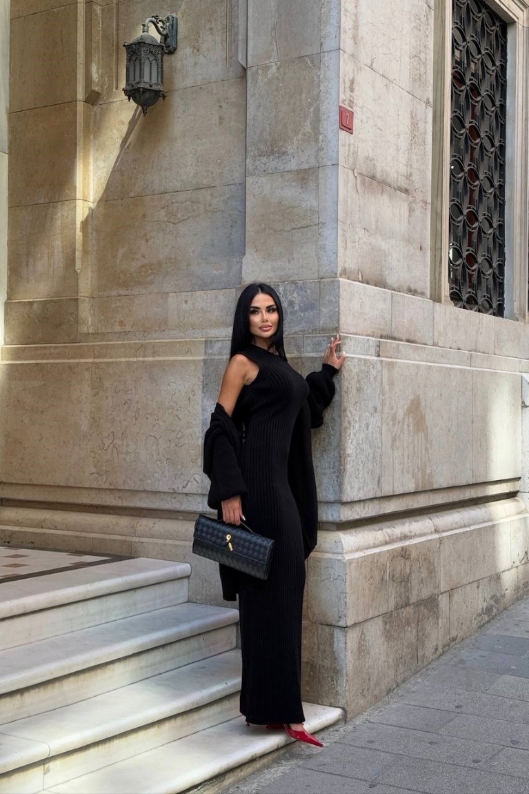 Αναδείξτε το στυλ σας με το ολοκαίνουργιο σετ πλεκτό ζιβάγκο και μακρυά ζακέτα σε μαύρο χρώμα.