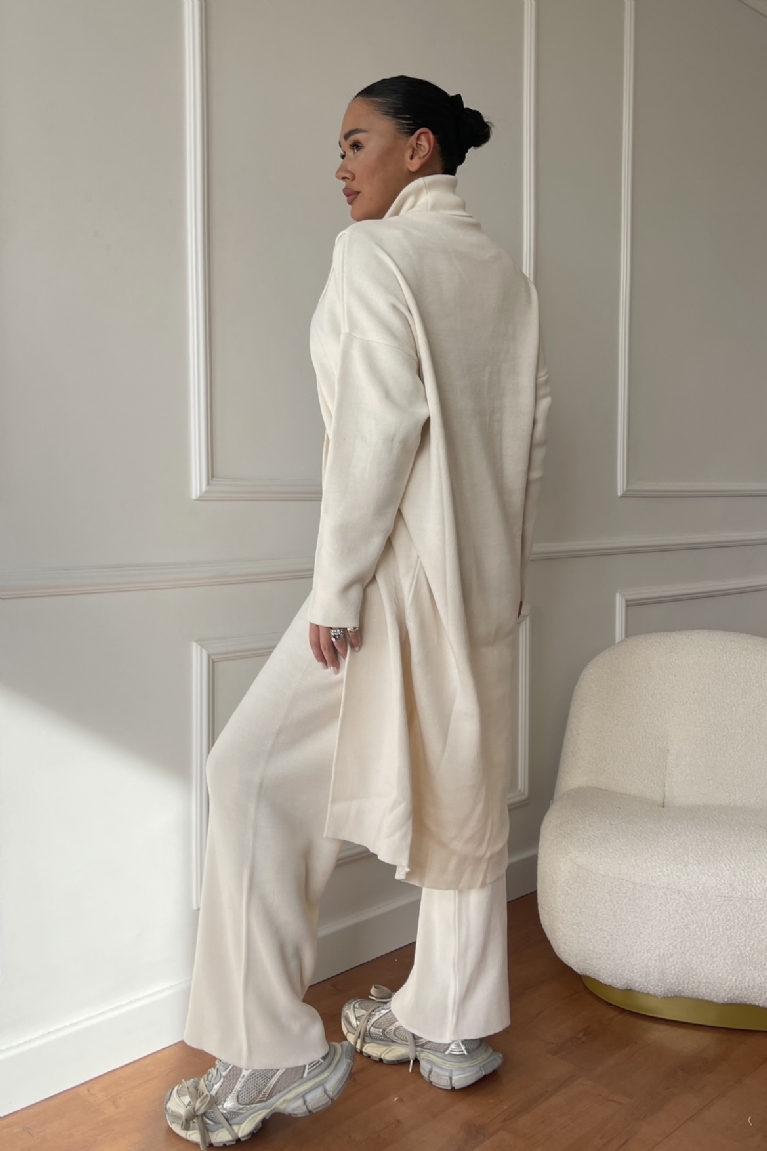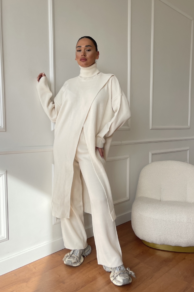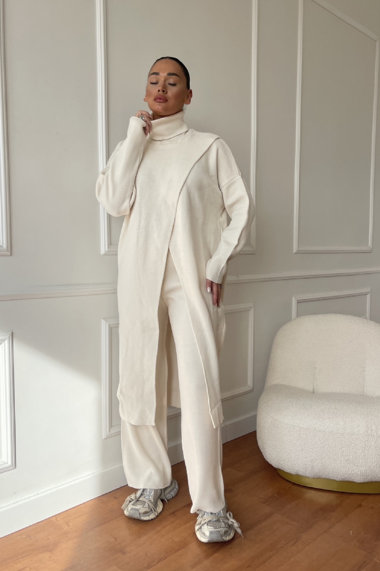 Ανανεώστε την εμφάνισή σας με το σετ πλεκτής μπλούζας ζιβάγκο ασύμμετρης γραμμής και παντελόνας σε εκρού απόχρωση.