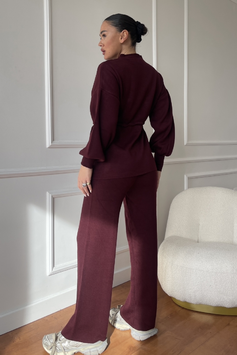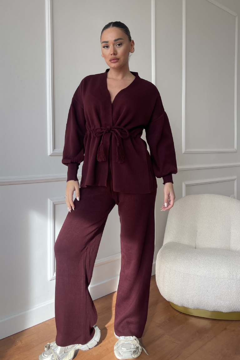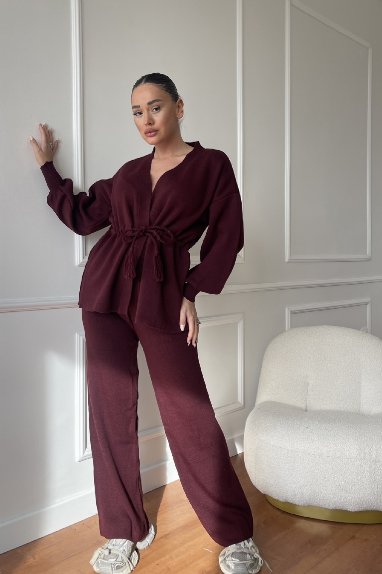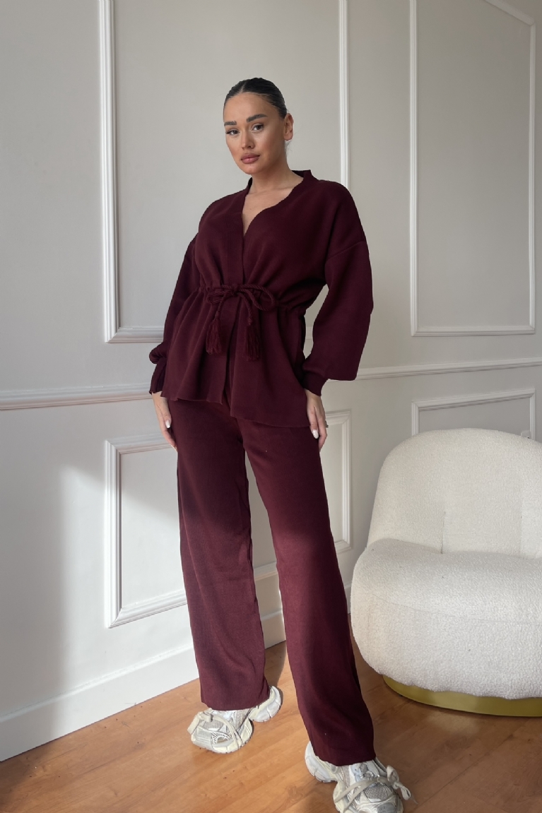 Σετ Πλεκτή Μπλούζα Με Δέσιμο & Παντελόνα - Μπορντό