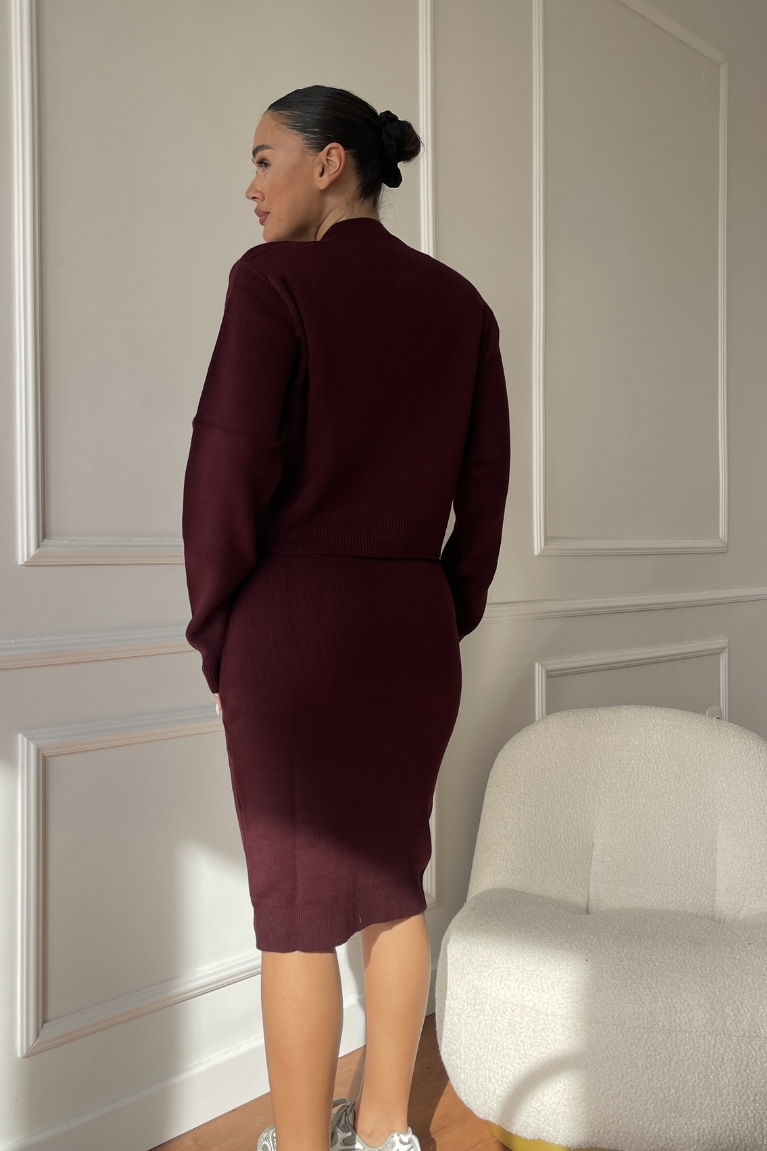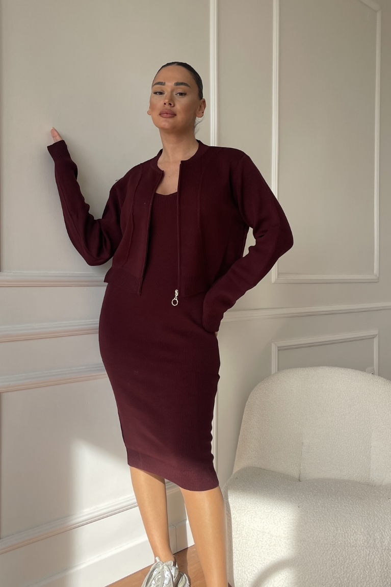 Σετ Φόρεμα Πλεκτό Τιράντα & Ζακέτα Με Φερμουάρ - Μπορντό