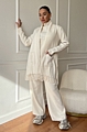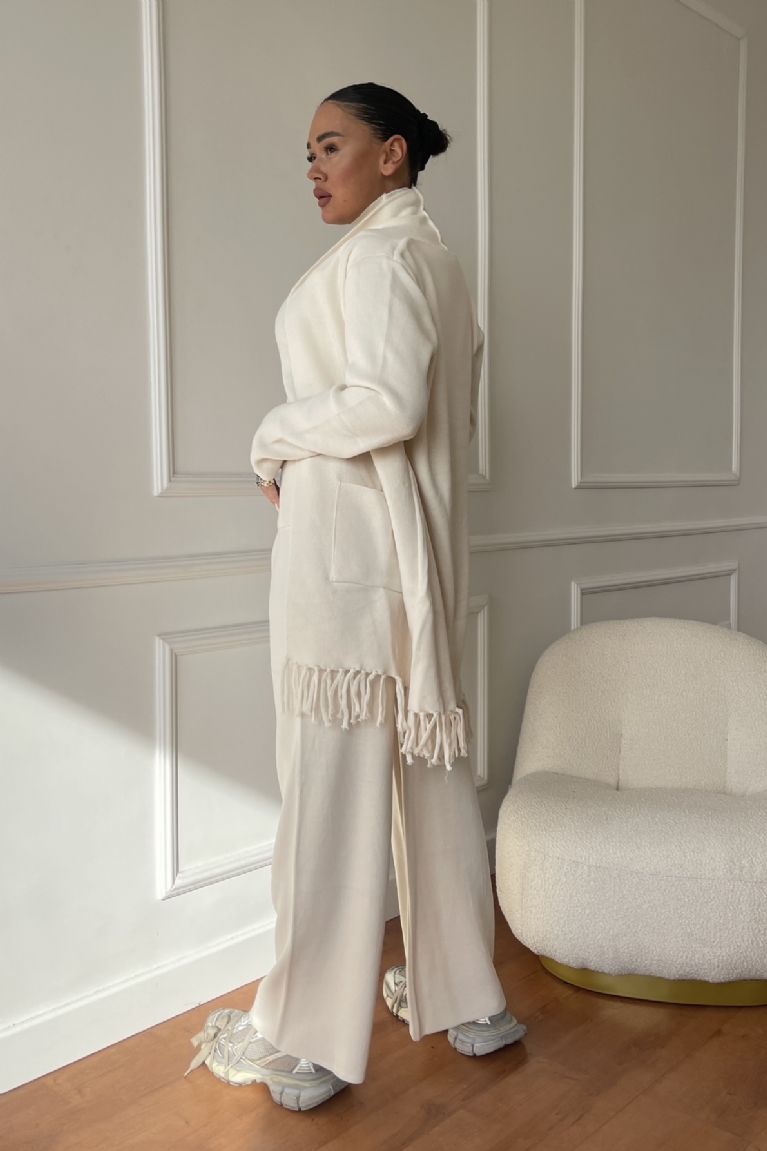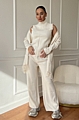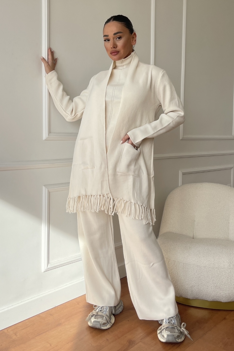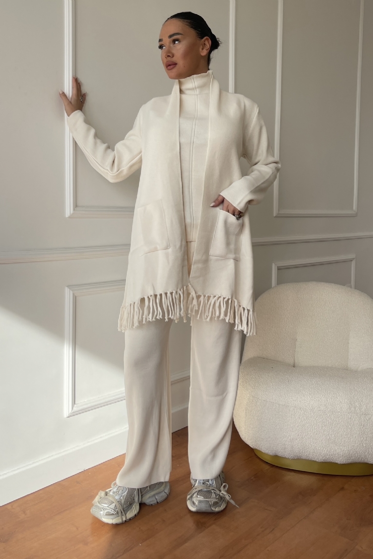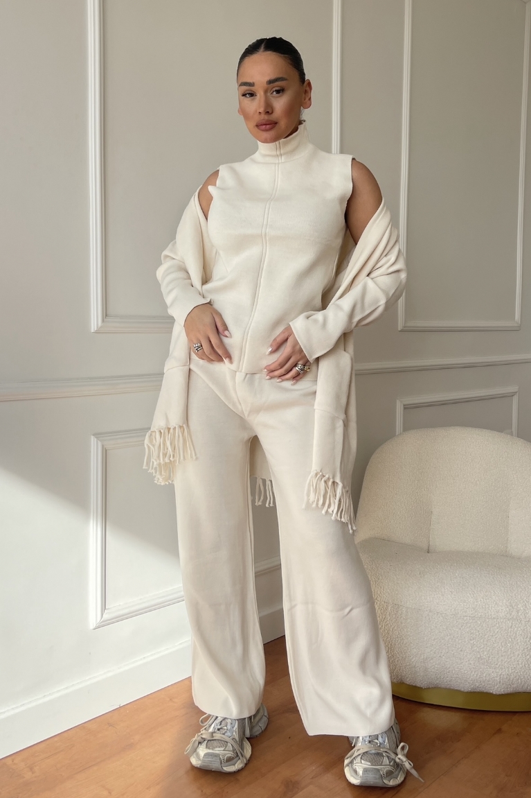 Σετ Πλεκτή Αμάνικη Μπλούζα Με Παντελόνα & Ζακέτα Με Κρόσια - Εκρού