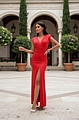 Οι σούρες αγκαλιάζουν διακριτικά το σώμα, δημιουργώντας κολακευτική σιλουέτα, ενώ το εντυπωσιακό σκίσιμο στο πόδι προσθέτει μια μοντέρνα, σαγηνευτική πινελιά.