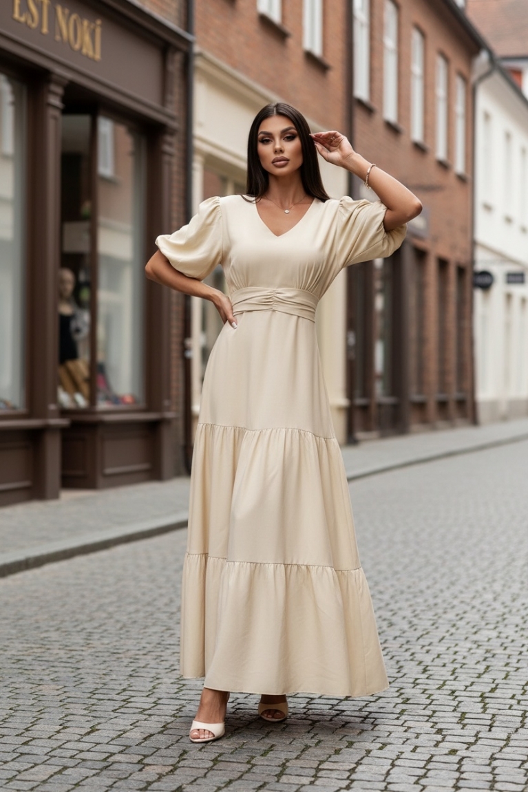 Αναδείξτε τη θηλυκότητά σας με το midi φόρεμα σε μπεζ απόχρωση, σχεδιασμένο για να αποπνέει κομψότητα και άνεση κάθε στιγμή της ημέρας.