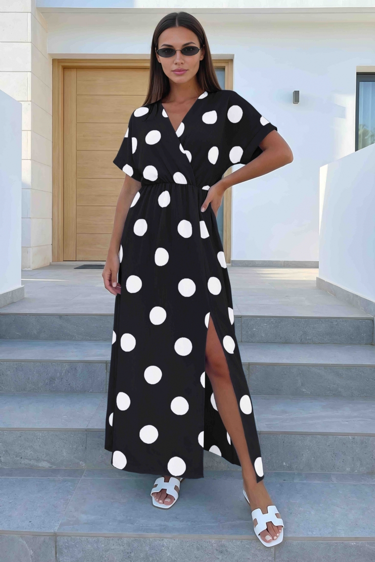 Αναδείξτε τη θηλυκότητά σας με το maxi φόρεμα με λευκά πουά και εντυπωσιακό σκίσιμο στο πλάι.