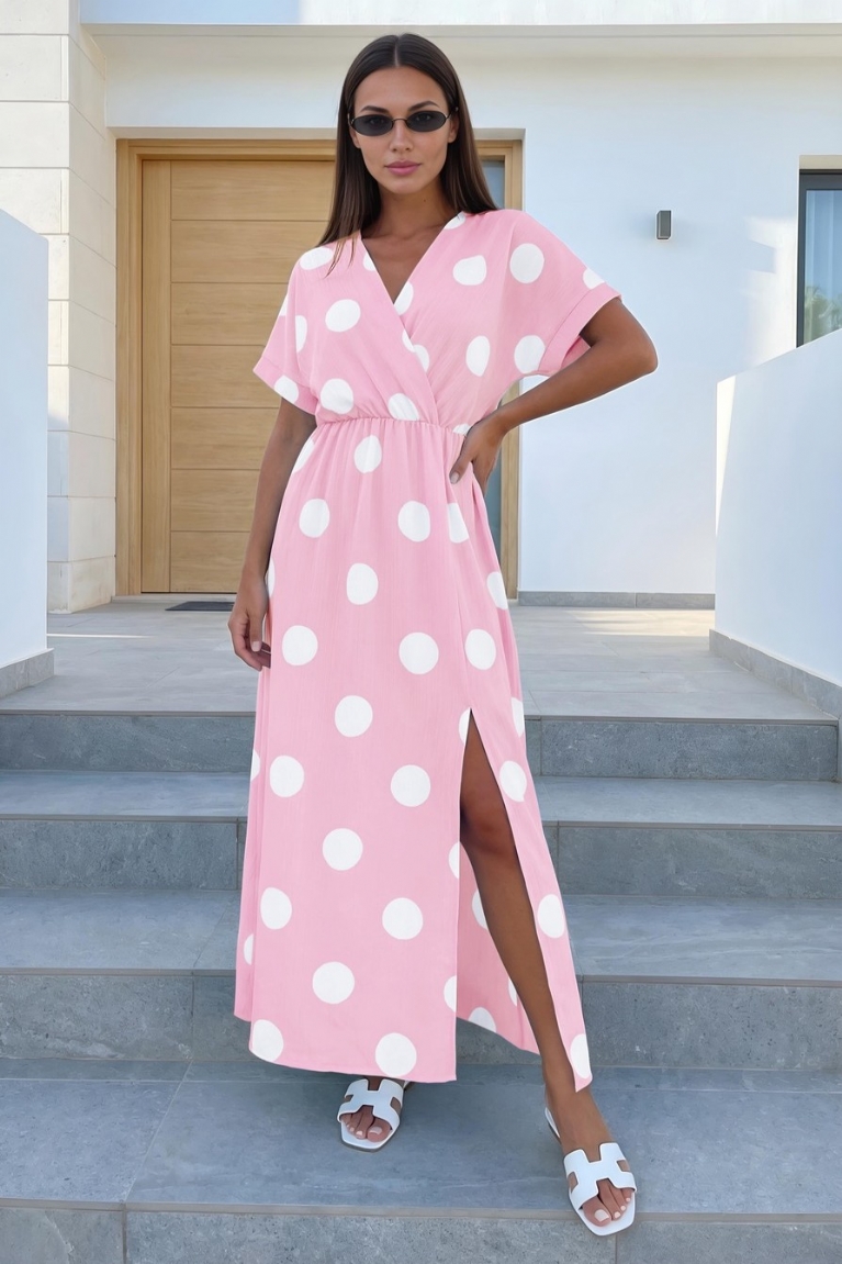 Αναδείξτε τη θηλυκότητά σας με το maxi φόρεμα σε ροζ απόχρωση, διακοσμημένο με λευκά πουά που μαγνητίζουν τα βλέμματα.
