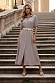 Το κοντομάνικο σχέδιο του σε διαχρονικό χρώμα πούρο αγκαλιάζει κομψά τη σιλουέτα, ενώ η ζώνη στη μέση τονίζει τη θηλυκότητά σας.