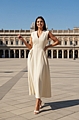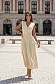 Αναδείξτε τη γυναικεία σας κομψότητα με το μπεζ Midi φόρεμα με σούρες και φερμουάρ.