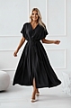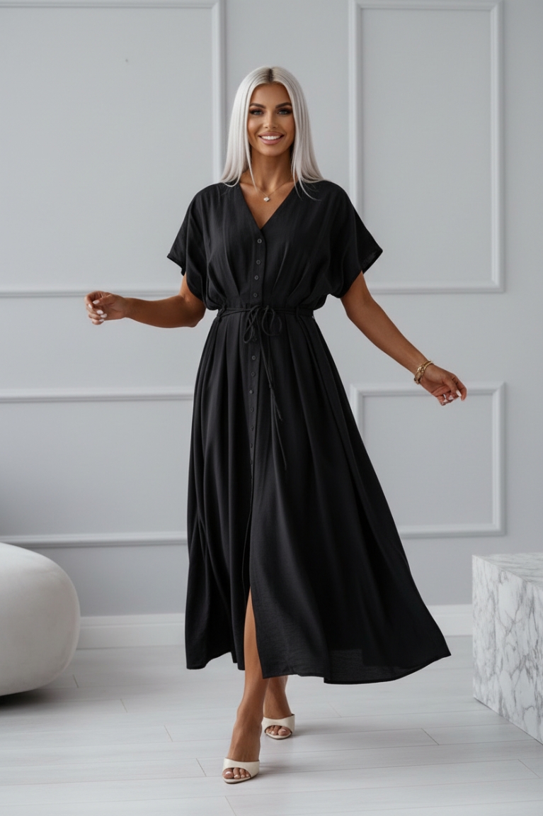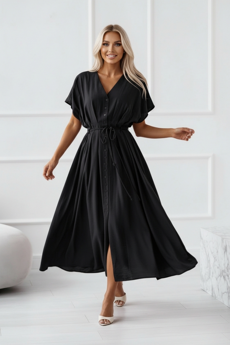 Αναδείξτε το στυλ σας με το κομψό μαύρο midi φόρεμα με κορδόνι στη μέση.