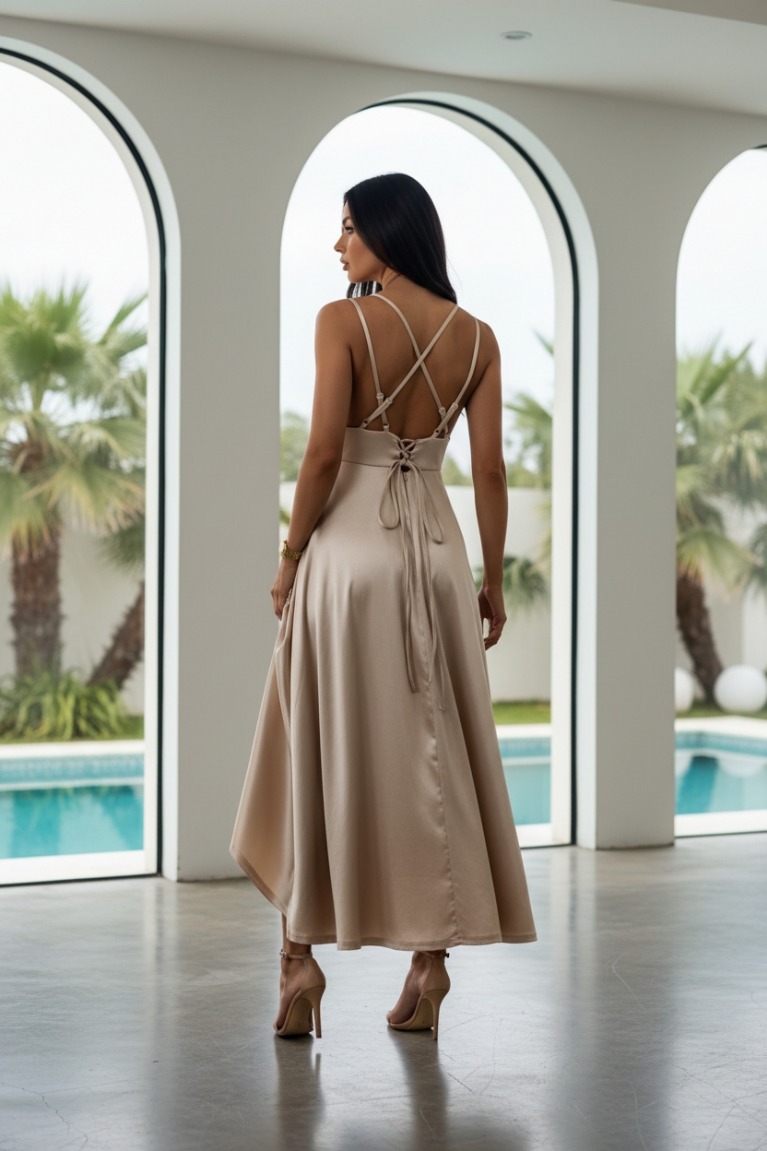 Αναδείξτε τη θηλυκότητά σας με το Maxi Φόρεμα με Πλισέ Λεπτομέρειες, Βαθύ Μπούστο & Ανοιχτή Πλάτη σε εκλεπτυσμένη μπεζ απόχρωση.