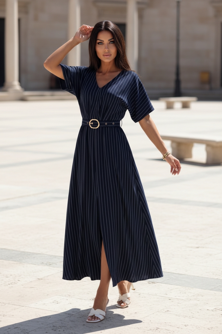Αναδείξτε το στυλ σας με το midi ριγέ φόρεμα σε κλασικό μπλε χρώμα, που συνδυάζει διαχρονική κομψότητα με μοντέρνα γραμμή.